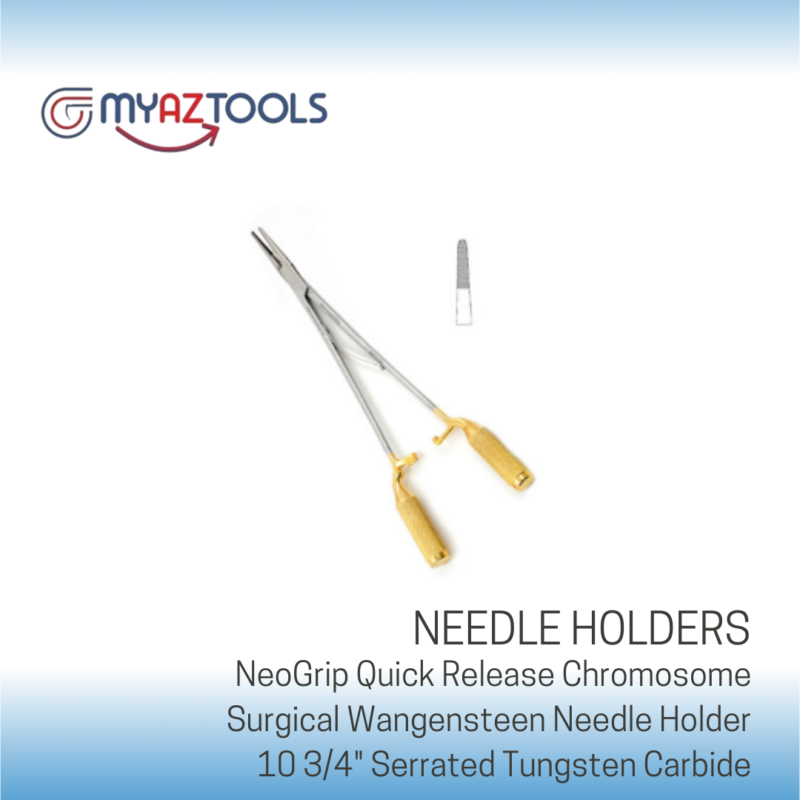 This quick-release special NeoGrip needle holder helps drive the fine suture needles. This NeoGrip surgical instrument is designed to work with the surgeon's hand for improved grip, balance, and efficient maneuvering within the surgical site. In addition, these easily handled instruments do not cause muscle fatigue or cramps. Surgeons prefer it for its german grade stainless steel material and ergonomic design. It has: NeoGrip Quick Release Chromosome Surgical Wangensteen Needle Holder 10 3/4" Serrated Tungsten Carbide does not cause muscle fatigue or cramps no matter how long you work with it. Palm grip and pencil grip are the best techniques to operate it. It features: •    Ergonomic grip •    Cross serrations •    TC inserts •    Quick-release mechanism