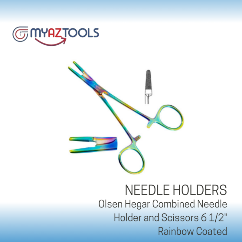 Olsen Hegar Combined Needle Holder and Scissors 6 1/2" Rainbow Coated is used in several surgical procedures for holding needles and cutting delicate tissues. This instrument has German stainless material, which makes it durable and rustproof. Additionally, it boasts high tensile strength and requires low maintenance.