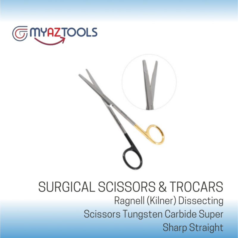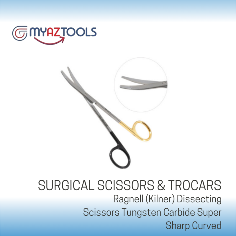 The Ragnell (Kilner) Dissecting Scissors Curved Tungsten Carbide are precision-crafted surgical scissors designed for delicate tissue dissection. Their curved blades and tungsten carbide construction provide exceptional sharpness and durability. They are manufactured from surgical-grade stainless steel and are available in multiple variations. The Ragnell (Kilner) Dissecting Scissors Curved Tungsten Carbide are essential for surgeons performing delicate tissue dissection. The curved blades provide excellent visibility and maneuverability, allowing for precise dissection in challenging anatomical areas. The tungsten carbide inserts ensure exceptional sharpness and durability, maintaining its sharpness even after repeated use. The finger-ring handles ensure comfortable and controlled use, reducing hand fatigue during extended procedures. •   Ā Atraumatic tips •    Multiple variations •    Finger-ring handle •    German-forged