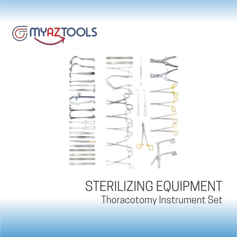 The Closed Thoracostomy Instrument Set is specially designed to perform various thoracic and cardiac surgical procedures. The set includes a wide range of thoracostomy instruments. It consists of different scissors, towel clamps, hemostatic forceps, trocars, and a knife handle.