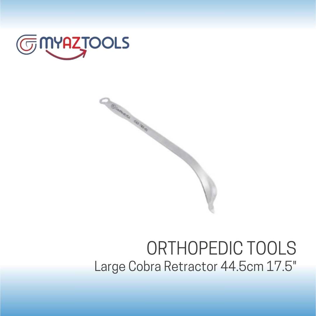 The Large Cobra Retractor 44.5cm is ideal for extensive orthopedic surgeries involving the hip and pelvis. The cobra-like curvature of the blade with one atraumatic prong is ideally designed for use around the acetabulum and femur. Its ergonomic design effectively retracts large volumes of tissue, providing optimal visibility and access to deeper anatomical structures during complex operations.