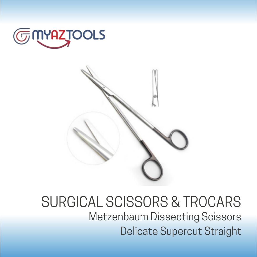 Metzenbaum Dissecting Scissors Delicate Supercut Straight features straight blades and blunt tips. These scissors have a long shank to blade ratio and are suitable for many surgical procedures. Moreover, they are durable, lightweight, and long-lasting. Make them part of your surgical kit as they have: